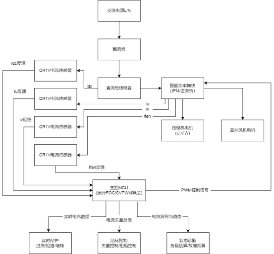在变频空调(特别是使用永磁同步电机的直流变频空调)中,电流监测是矢量控制算法的基石。