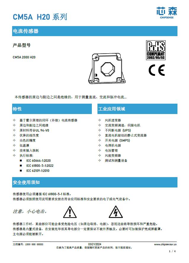 随着光伏电站向大容量、高电压方向快速发展,集中式逆变器的直流侧电流已普遍突破千安级别,对电流传感器的测量能力、安全性和环境适应性提出了前所未有的挑战。芯森电子推出的CM5A 2000 H20高精度闭环电流传感器,凭借其±2000A超大测量范围、6kV绝缘耐压、0.3%精度等核心优势,成为集中式逆变器电流检测的标杆级解决方案。