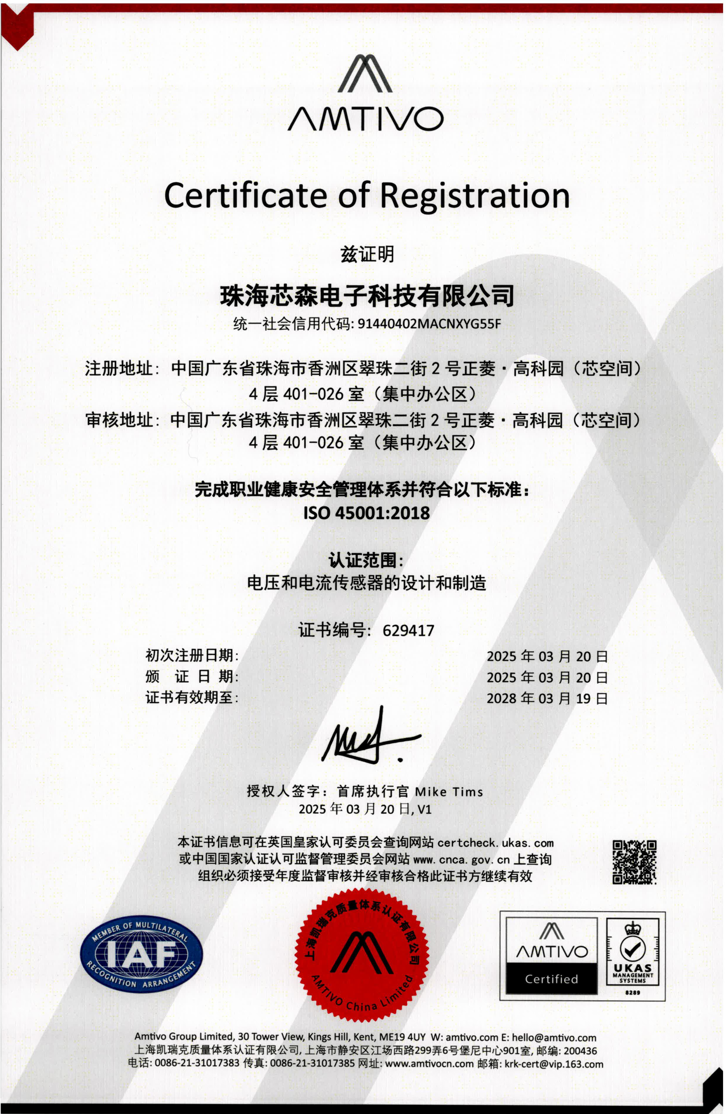 经第三方认证机构实地审核评价,芯森电子职业健康安全管理体系满足标准要求,顺利通过审核,获得认证资质!