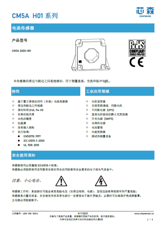 l 高精度与低温漂:CM5A系列传感器CM5A系列传感器以其卓越的高精度电流传感器和低温漂电流传感器特性著称,精度达到±0.3%,在-40℃~85℃的极端温度范围内保持性能稳定工作,确保了在不同气候条件下都能提供稳定、准确的电流测量结果。