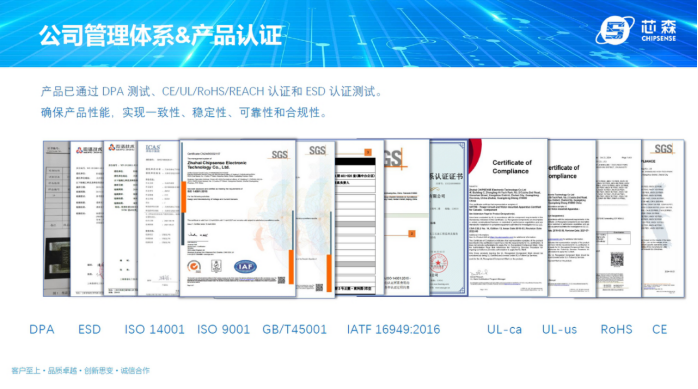 芯森电子已通过IATF 16949:2016汽车质量管理体系认证,并完成ISO 9001(质量管理)、ISO 14001(环境管理)三体系审核。这一认证是进入全球汽车供应链的“通行证”,保障其产品在特斯拉、比亚迪等车企中的稳定供应。