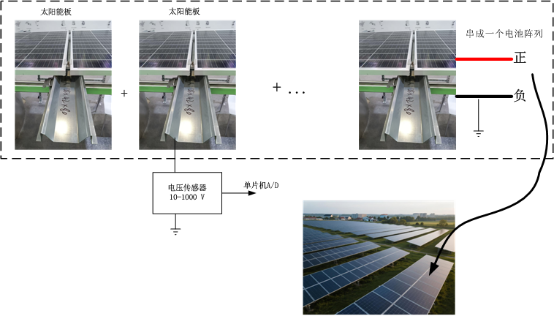 在高压PV电源的金属外壳与地之间,接入一个检测用的电压传感器,实时的监测其电压,一旦PV绝缘层被破坏而导致的金属外壳带电会被检测到。程序控制只要高于36V的安全电压,输出声光告警,并把告警信息通过PSTN/WIFI等手段传输到远端后台,这样就组成了一套完整的应用系统。
