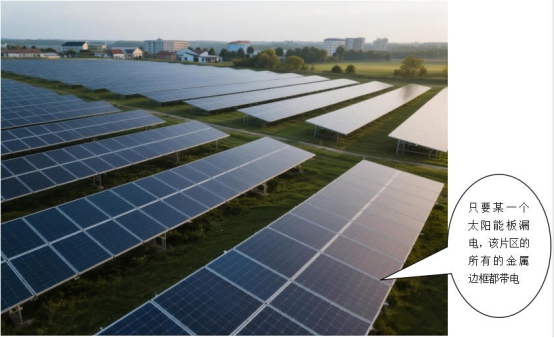高压的PV电源就是这种最小单元的太阳能板,以类似肩并肩的方式固定安装。那么只要一处发生有漏电,整个外框就将全部带电。
