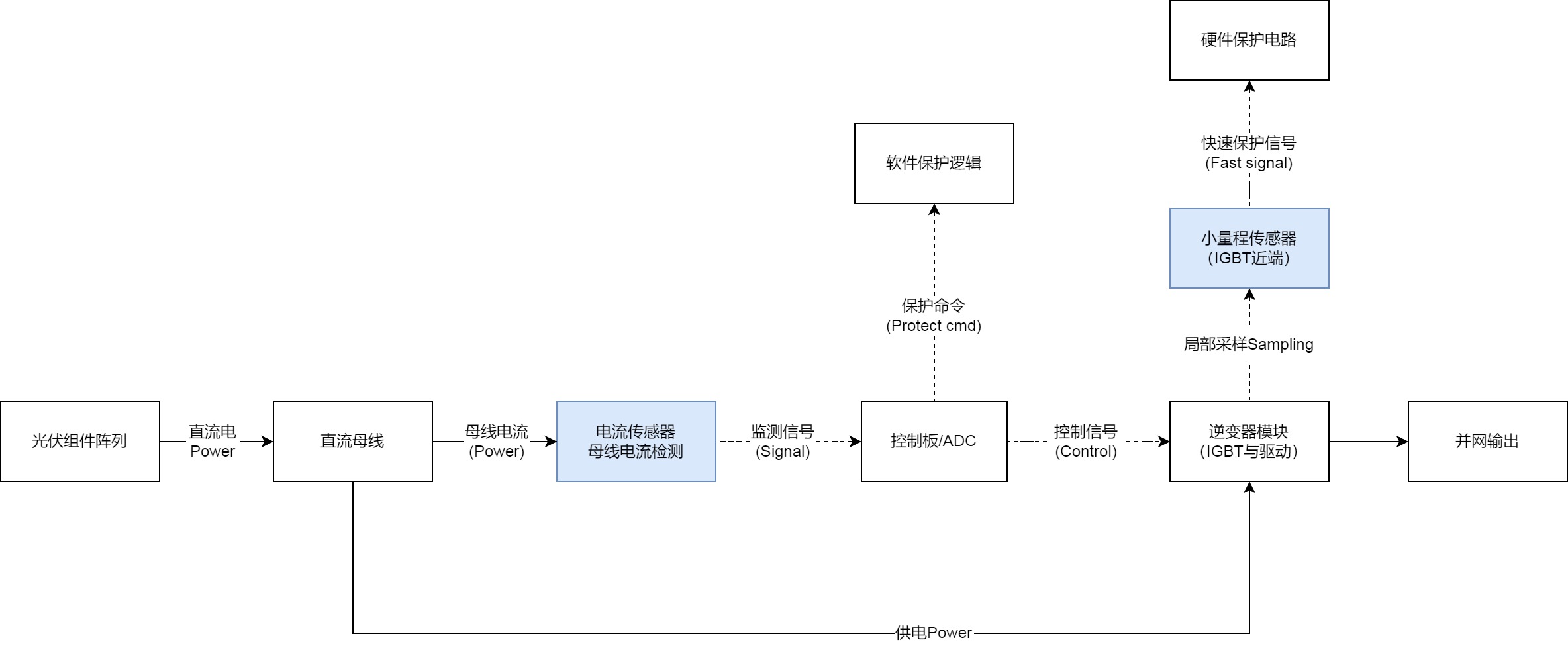 定位:电流检测同时承担监测(数据采集/能量计量)、控制输入(与 MPPT、逆变器控制回路联动)与安全保护(过流、短路检测)。因此传感器必须兼顾精度、带宽、绝缘与温漂特性。