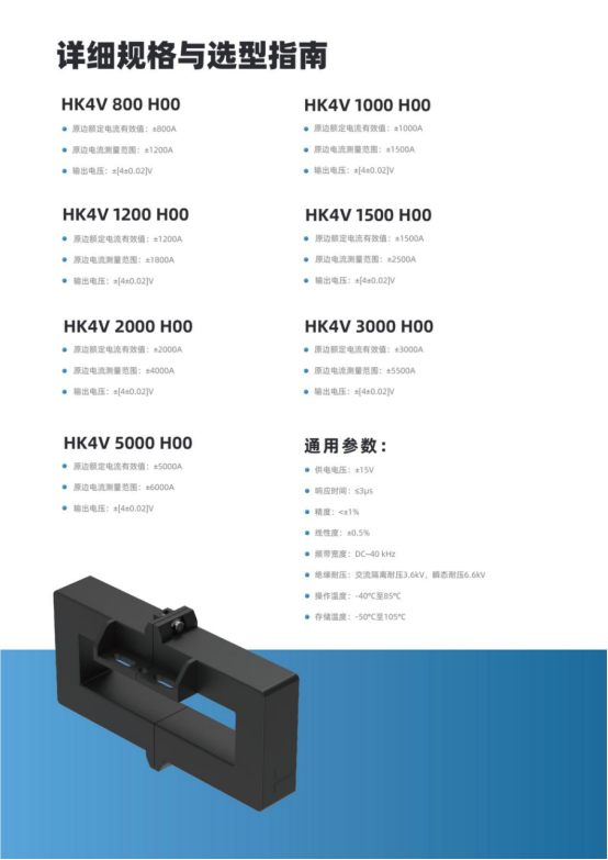 HK4V H00系列开口式电流采样传感器,以“便捷安装、精准测量、安全可靠”为核心优势,破解了传统电流传感器安装复杂、停机损失大、适配性差的痛点。其开口式设计、宽范围测量、高安全性能与简易操作的完美结合,使其在工业、新能源、轨道交通等多领域具备广泛应用价值。无论是新建系统的高效部署,还是既有系统的升级改造,HK4V H00都能显著降低集成成本、提升监测效率,成为工业电气系统中“即插即用”的优选方案,为行业智能化升级注入新动力。