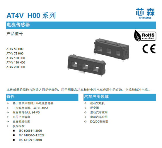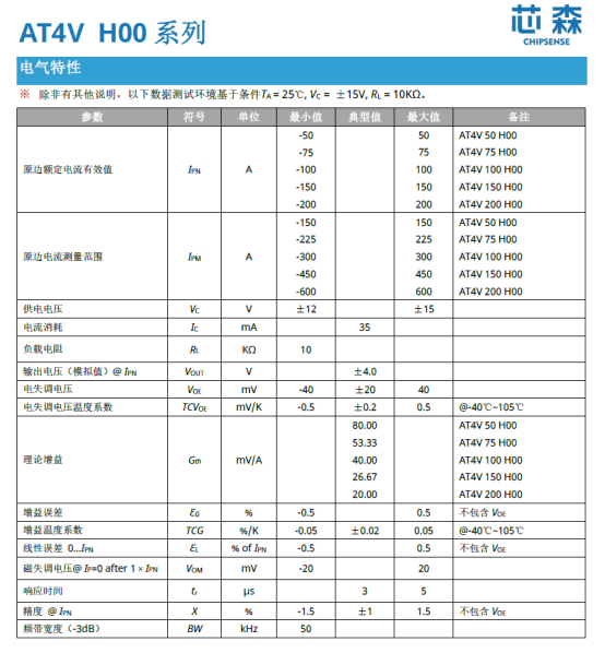 l 宽电流覆盖:提供50A至200A额定型号(IPN),对应测量范围±150 A至±600 A(IPM),可覆盖10kW级变换器需求(如AT4V 50 H00支持±150A过载);