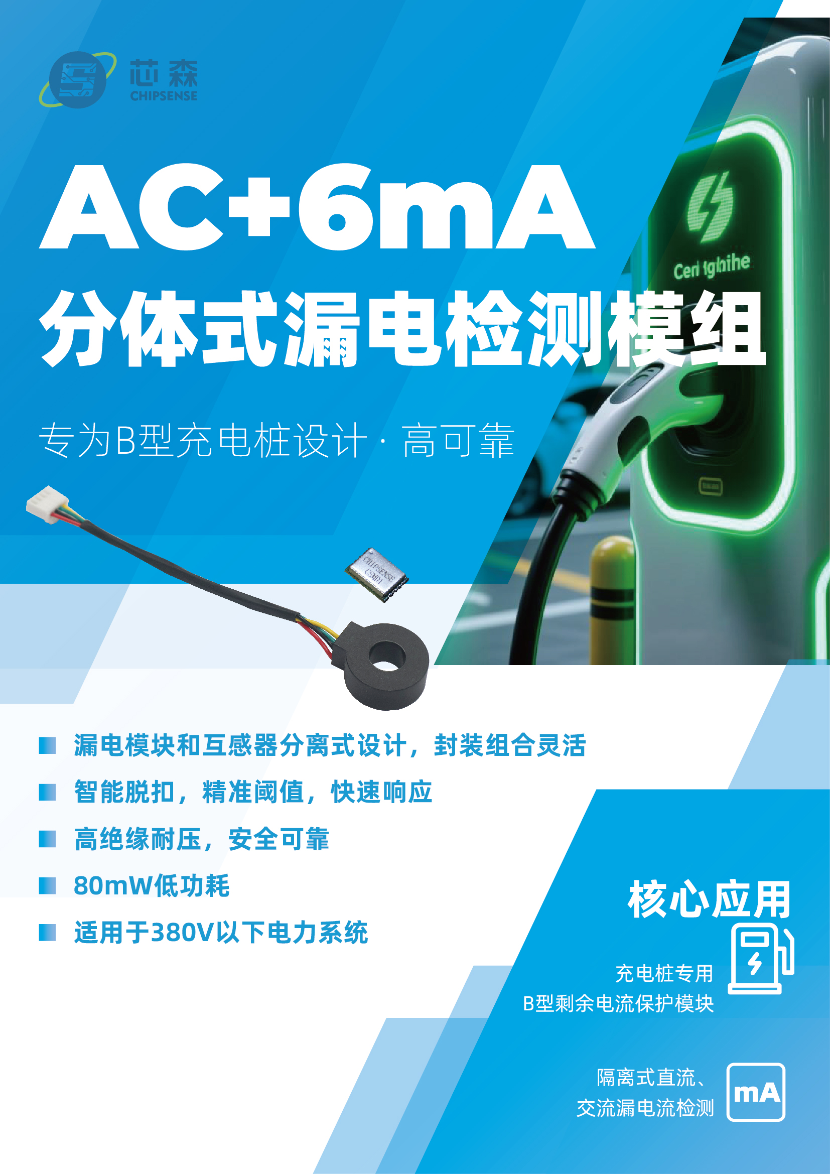 充电桩B型剩余电流检测新方案!芯森电子分体式模组上市:AC/DC + 6mA高精度+隔离检测,灵活适配复杂场景