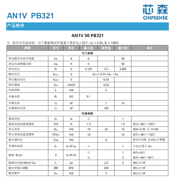 基于芯森电子实验室测试平台( TA=25℃,VC=3.3V),AN1V系列关键性能如下: