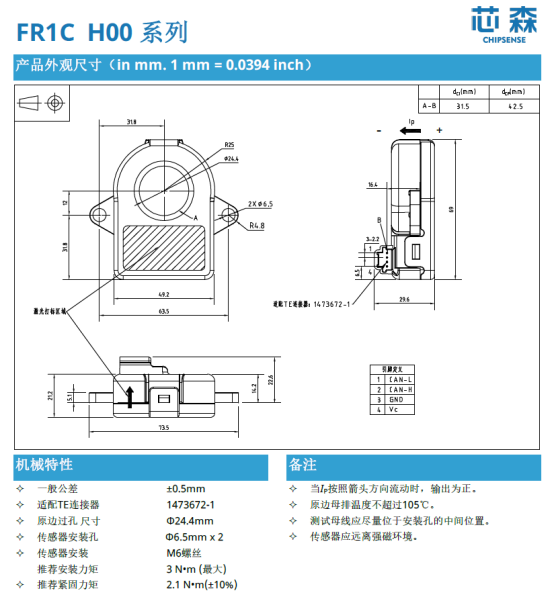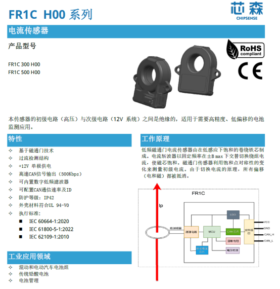 本方案选用芯森电子FR1C H00系列磁通门电流传感器,该系列专为高压绝缘、高精度电池监测设计。