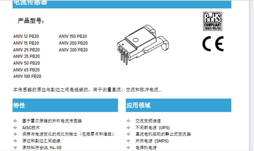 AN1V系列是芯森基于霍尔技术研发的高精度开环霍尔电流传感器,具有出色的精度、很小的温漂、优异的线性度,测量电流范围从50A~300A,单5v或者单3.3V供电,由于测量精度高、体积小、功耗低、单电源供电、宽温度范围和原副边隔离耐压高等优点,非常适合车载充电器和DC-DC转换器的应用。如需详细规格书请联系芯森。
