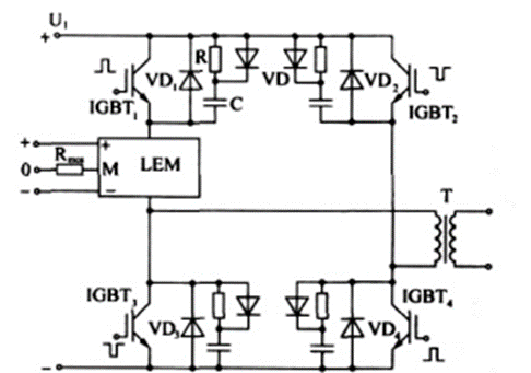在弧焊逆变电源中, 逆变器的开关频率一般都工作在 20 kHz 以上, 逆变器所用的电子器件如 MOSFET、IGBT、快恢复二极管、续流二极管以及 RC 网络元件等的开关特性将直接影响到逆变器工作的稳定性和可靠性。