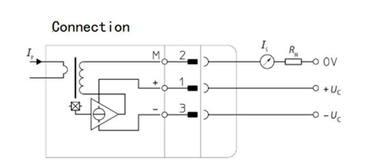 原边导线插入传感器中间孔径,原边电流产生的磁力线与CM1A 内置元件产生感应电压,再经过后续电子电路输出副边电流。注:CM1A H00输出增益为0.5,连接电路图如下图所示。