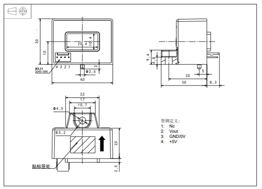 AS1V H00通孔为方形,原边导线插入传感器中间孔径,原边电流产生的磁力线与AS1V H00内置元件产生感应电压,再经过后续电子电路输出副边电流。注:AS1V H00输出增益随产品量程变化,管脚定义及三视图如下所示。