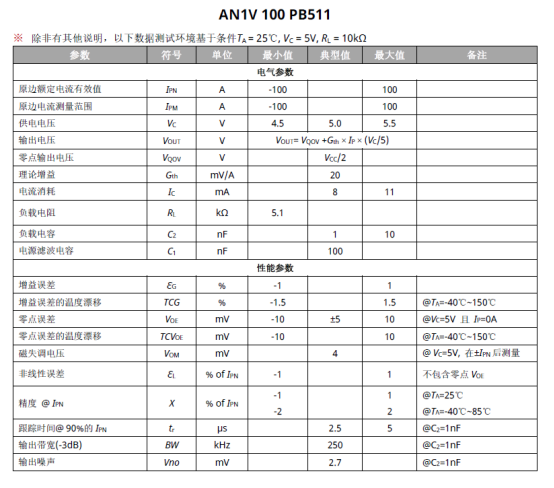 以芯森AN1V PB511系列为例,它是基于ASIC芯片技术的微型霍尔电流传感器,实现小尺寸封装和100%国产化,该系列包含多款型号,量程从50~300A。从其公开规格书中,我们可以清晰地看到它如何满足扫地机的需求。