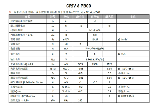 CR1V PB00系列电流传感器采用原边与副边绝缘设计,符合IEC 60664-1、IEC 61800-5-1等国际标准。其绝缘耐压测试达2.5kV(50Hz,1min),瞬态耐压9kV,爬电距离15.5mm,电气间隙6.35mm,确保在复杂工业环境中的安全运行。